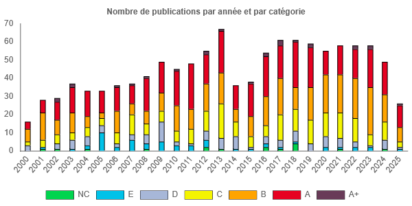 Ci-contre  le graphe du nombre de publications par année et par catégories , issu du portail SIGAPS